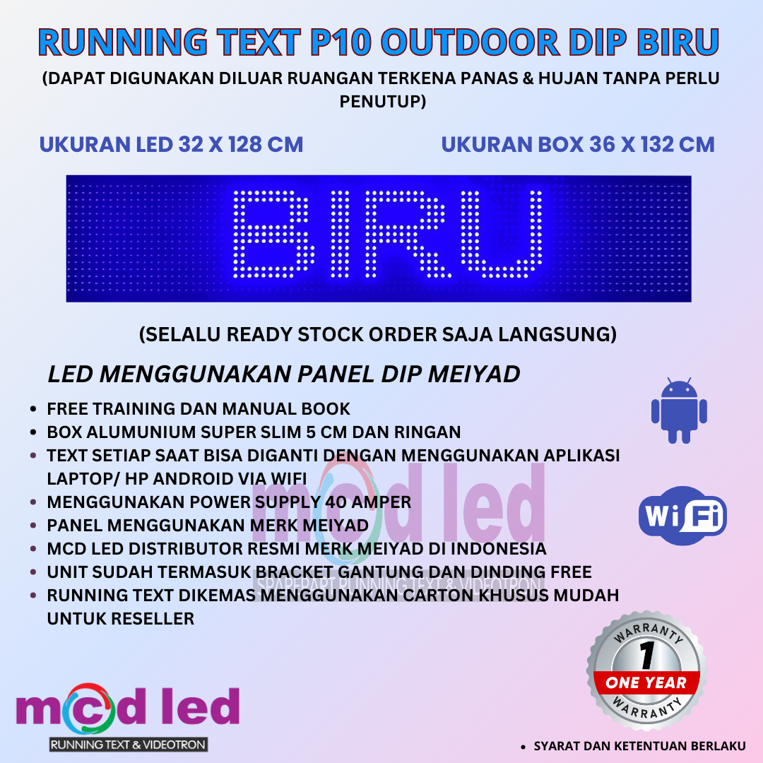 RUNNING TEXT 32X128 CM P10 LED DIP OUTDOOR WARNA BIRU UKURAN BOX 36X132 CM